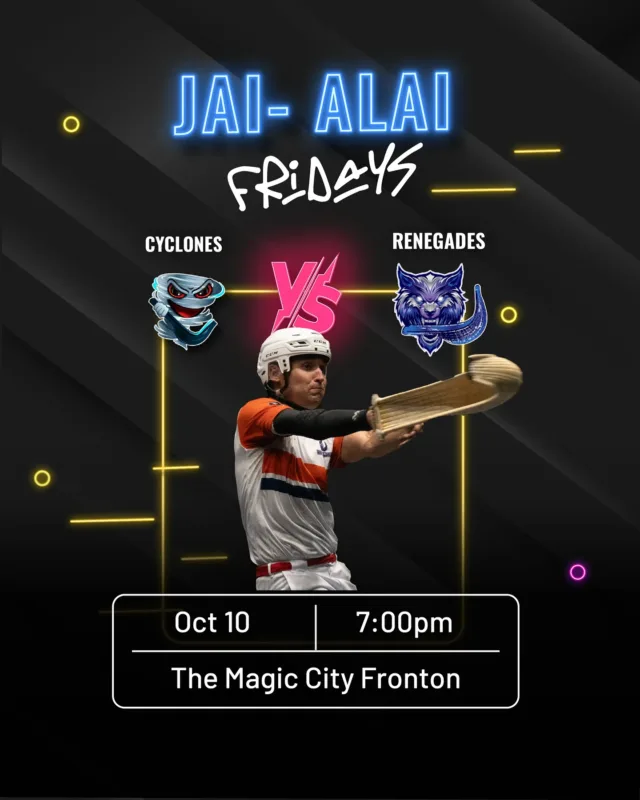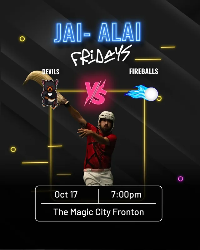 Come experience the excitement of Jai-Alai Fridays at the Magic City Fronton! Every Friday night you can expect competitive Jai Alai matches, a high energy crowd, food & drink vendors, and endless entertainment. Watch your favorite Battle Court teams go head-to-head right here in Miami.